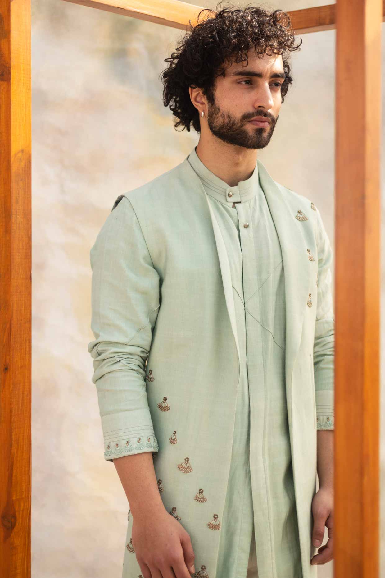 Featuring A Duckegg Shrug Set On A Slub Silk Base With Placement Tone-On-Tone Embroidery, Highlighted With Dabka. Paired With A Front Open Silk Kurta And Silk Tapered Trousers.