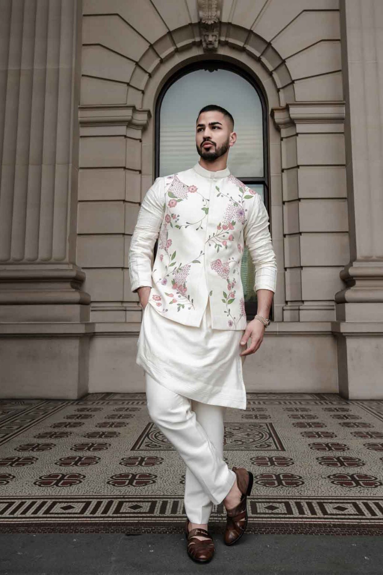 Presenting Porcelain Petals Nehru jacket set on a slub silk hand-textured base with intricate hand paint floral details and 3-D gold elements. Paired with a tone-on-tone kurta and tapered trousers.