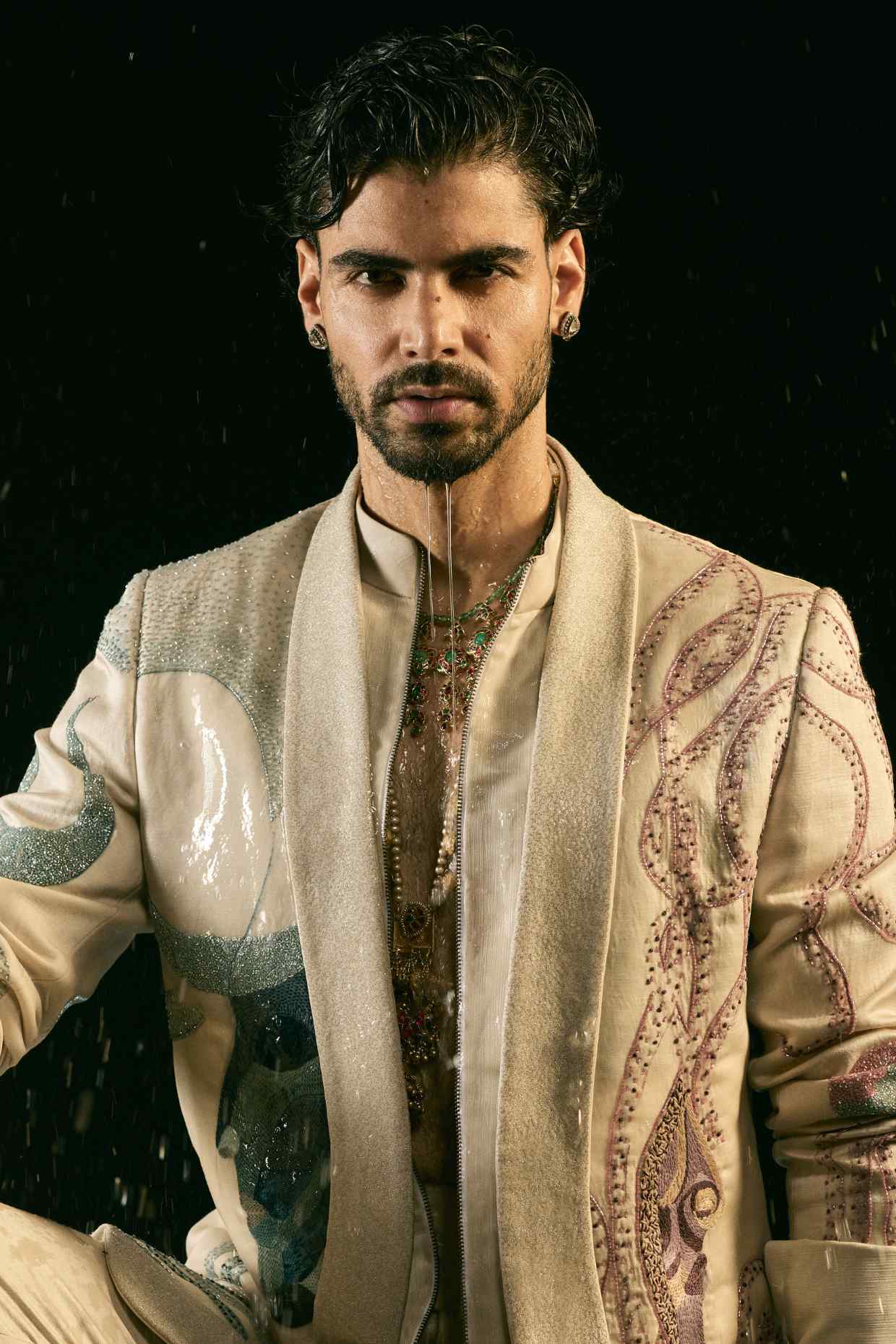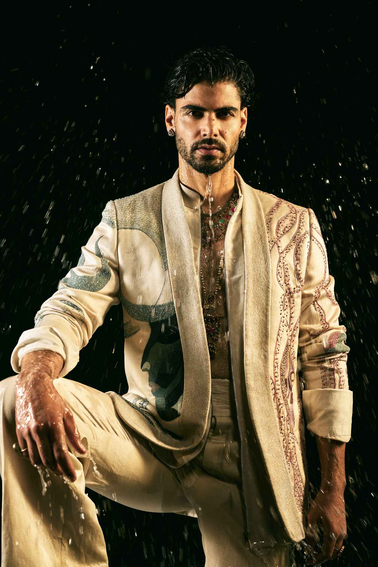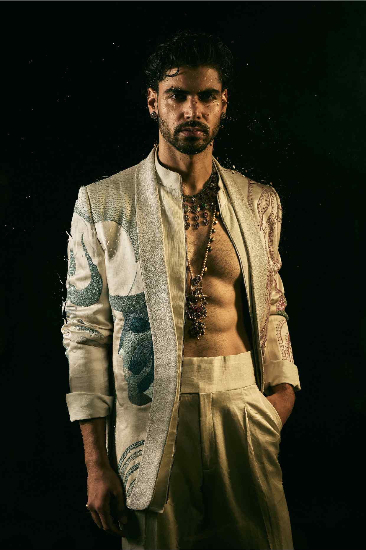 Presenting SHIV SHAKTI, our concept blazer in the new Silver Veil colour. Handpainted and hand-embroidered using multi colour threads and sequins. Paired with a zipper shirt and straight trousers, this blazer is a modern ode to balance and duality.