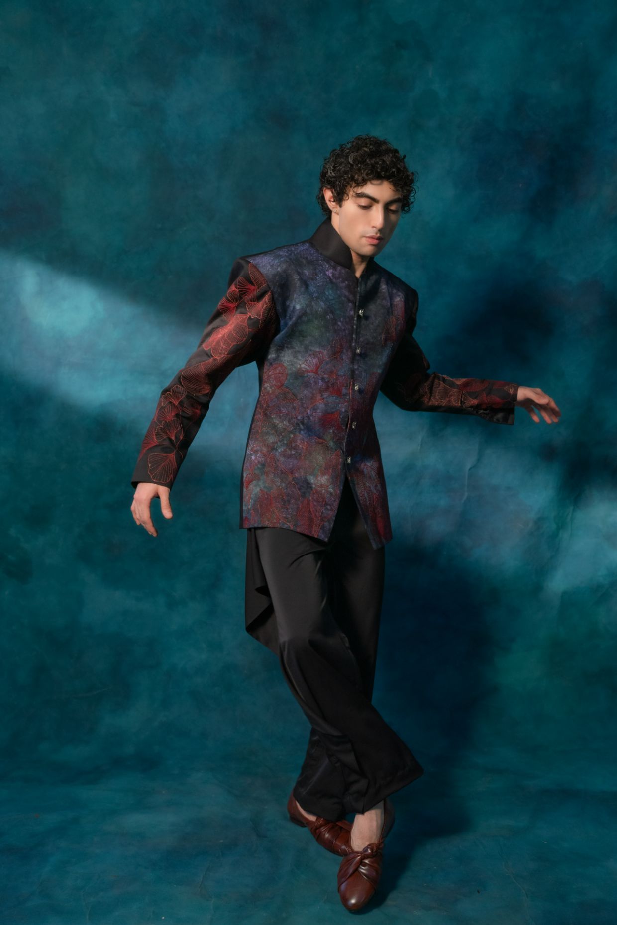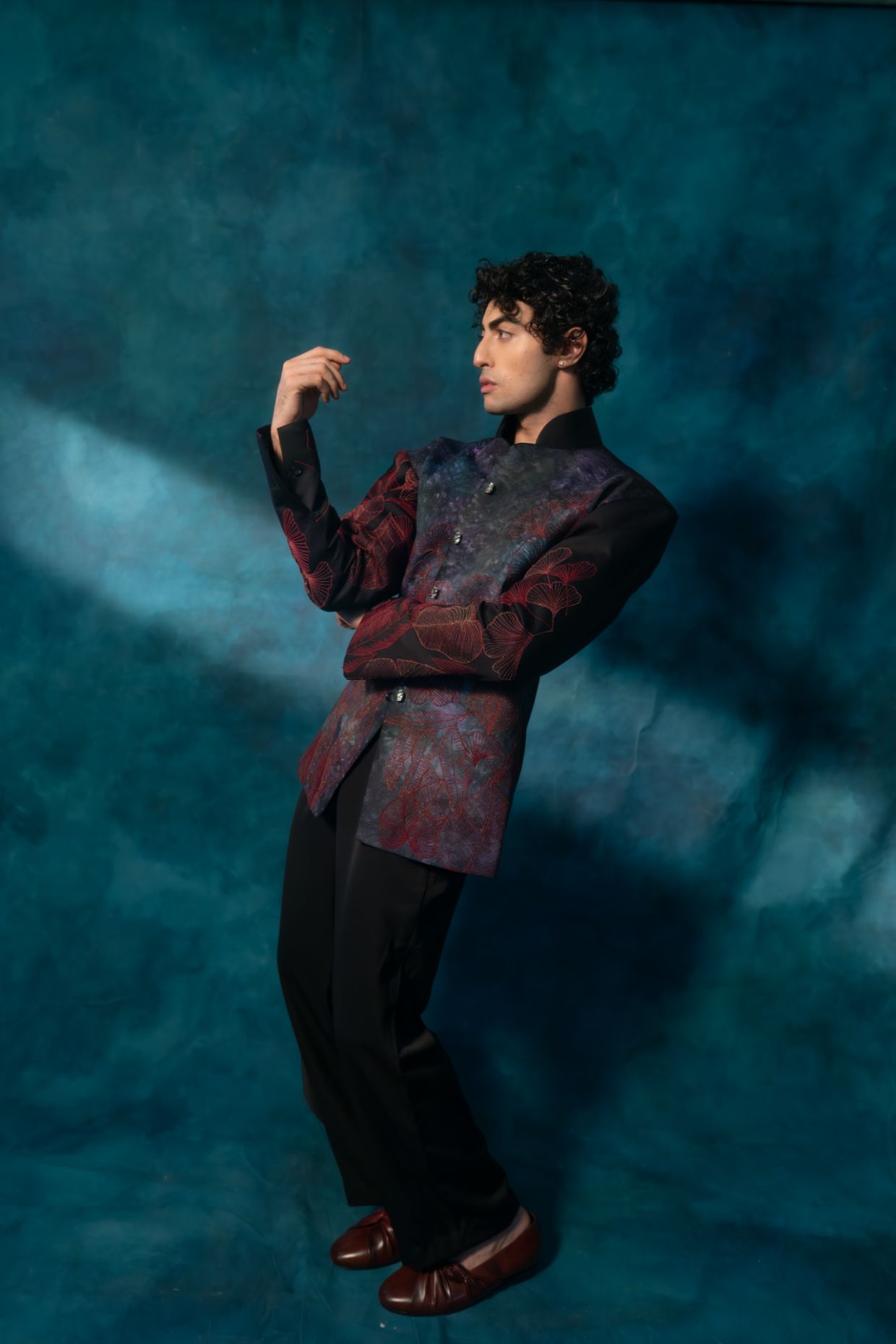 Presenting the Garden blazer set on black cotton fabric, with a landscape-inspired sage -lilac hand painted base, crimson embroidered flowers, and drop shoulder silhouette with extra padding. Paired with a black tapered trousers.