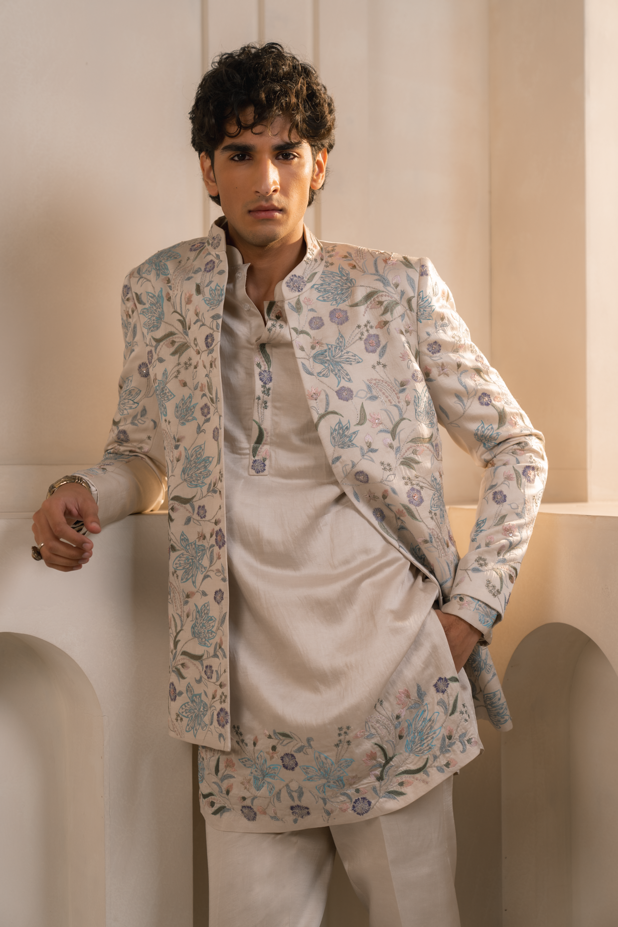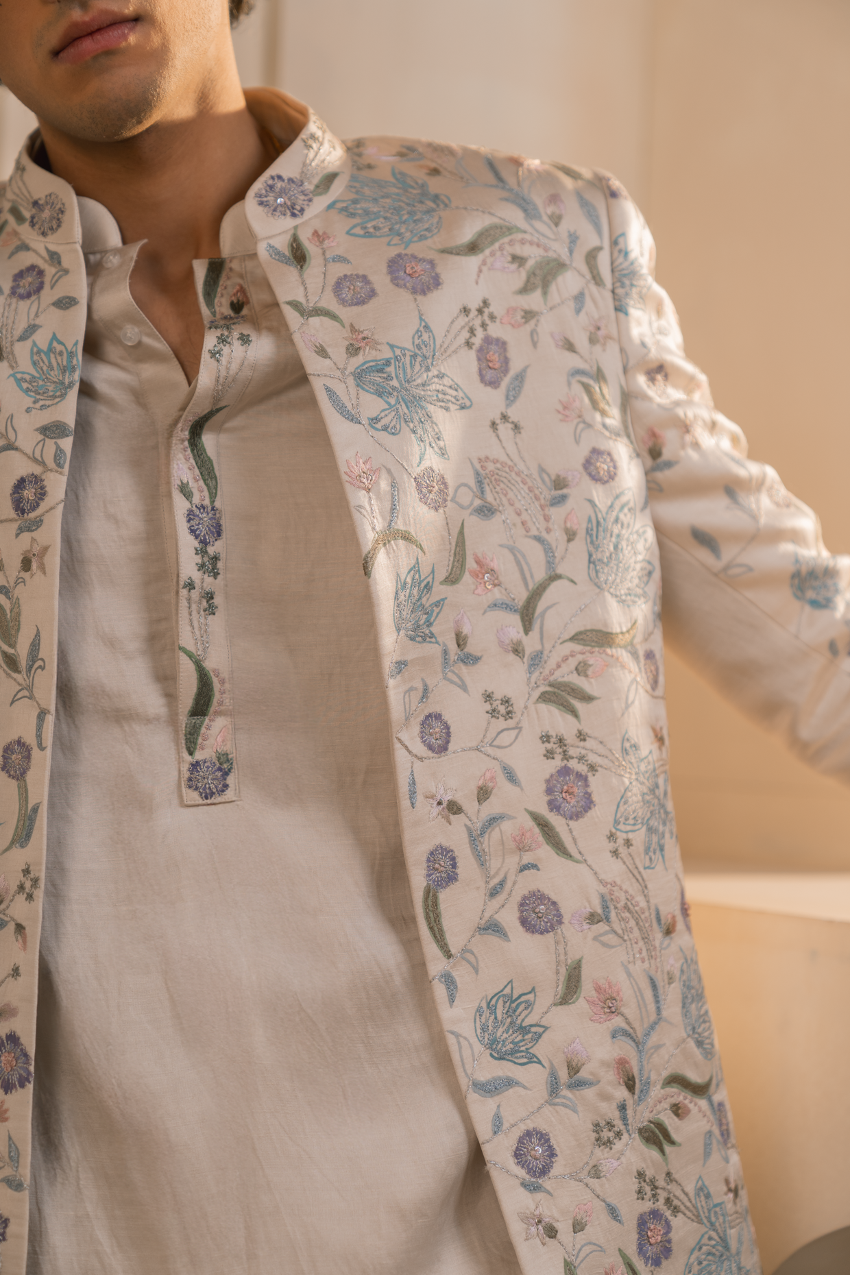 Vishwa Set in Silver Veil, a refined linen silk bandhgala set featuring intricate hand painting and colourful embroidery. Designed for modern grooms, it’s the perfect choice for elegant day wedding celebrations. Paired with a hand-painted kurta and tapered trousers.